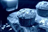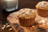 Oatmeal Raisin Muffin on Wooden Table with Glass of Milk