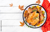 Roasted turkey garnished with cranberries on a rustic style table decorated autumn leaf. Thanksgiving Day. Baked chicken. Top view