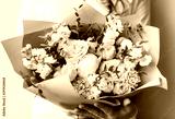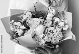 Very nice young woman holding a beautiful blossoming flower bouquet of fresh mattiolas, roses, peony, carnations, eucalyptus in pastel pink colour on the grey wall background