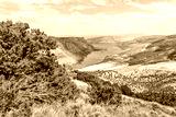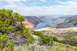 Panoramic view of Sheep Creek Overlook and bush in Manila, Utah near Flaming Gorge National Park with cloudy valley and river