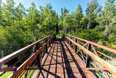 Snowmass Aspen village town in Colorado downtown with bridge at Brush Creek trail with nobody in summer wide angle view