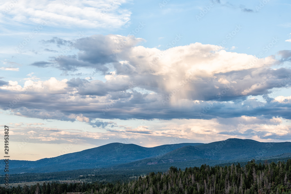 Canyon Rim trail overlook view of sky near campground in Flaming Gorge Utah National Park at sunset with colorful clouds and mountains