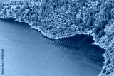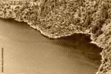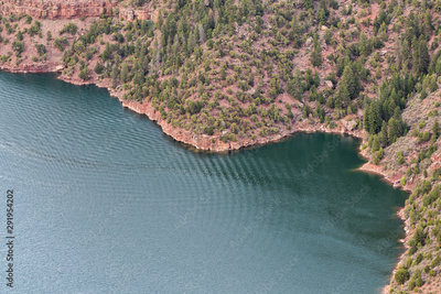 Canyon Rim trail overlook view closeup near campground in Flaming Gorge Utah National Park with Green River at sunset with boat