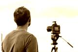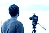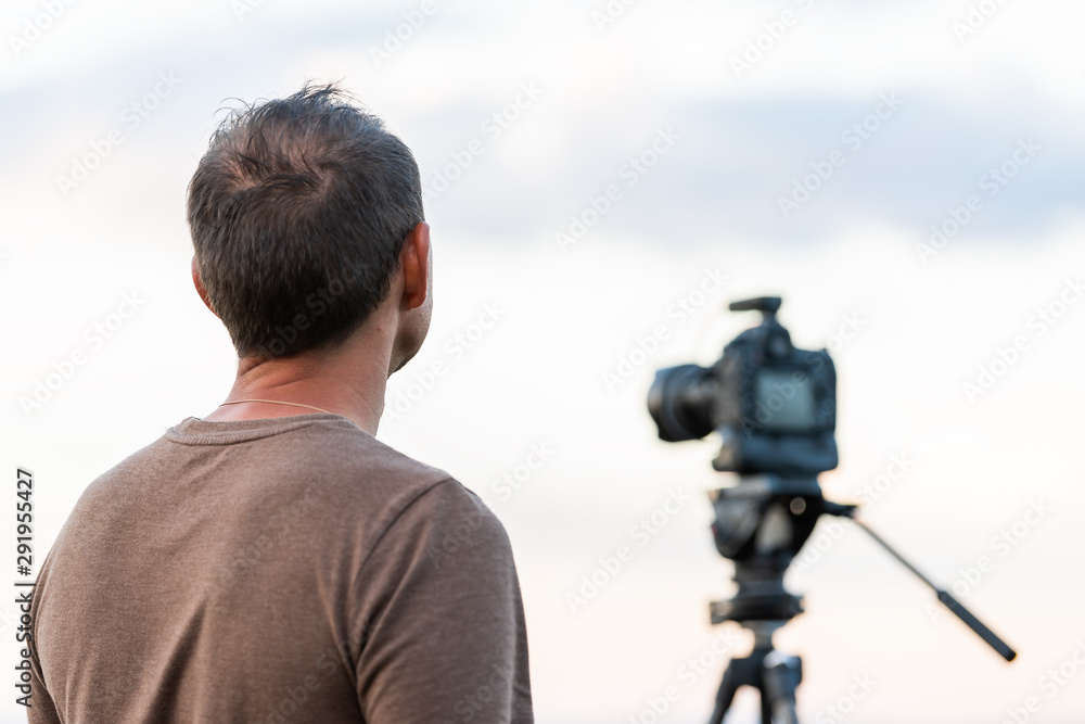 Man standing looking at view closeup with camera on tripod at Canyon Rim overlook view near campground in Flaming Gorge Utah National Park