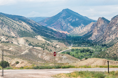 View of canyon mountains near Flaming Gorge Utah National Park in Wyoming border side with winding road and formations