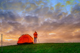 traveller woman enjoy taking photo stay along with tent at sunrise on the peak of mountain