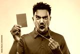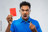 sport, caution, game and football concept - angry indian male referee with whistle and showing red penalty card