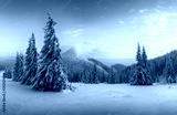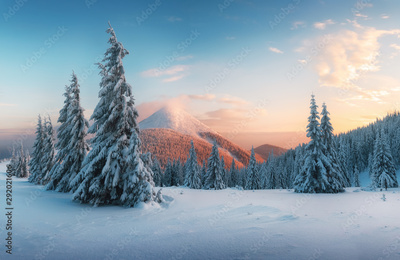 Fantastic orange sunset in snowy mountains. Picturesque winter scene with snowy trees and glowing mountain peak