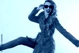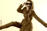 Close up happy girl in red sunglasses and pink coat isolated on white background. excited, shock and surprised young woman, trendy outfit. Fashion and shopping concept. Long wavy hair. Selective focus