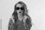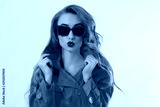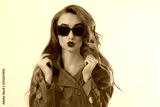 Close up woman face. Red lips and stylish sunglasses. Close-up kiss face and fashion girl in pink coat clothes isolated on white background. Autmn fashion concept. Copy space. Make up and beauty