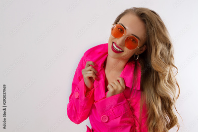 Happy, shock, excited woman face closeup. Girl in bright pink autumn clothes, red sunglasses isolated on white background, copy space. Beautiful female surprised, cheerful. Fun funny model screaming