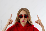 Young stylish woman with red lips, sunglasses and sweatshirt poiting copy space isolated on white background. Closeup girl face makeup. Fashion and beauty concept. Place for advertising