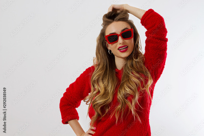 Happy, shock, excited woman face closeup. Girl in bright red hoodie autumn clothes red sunglasses isolated. white background, copy space. Beautiful female surprised, cheerful. model Fun time