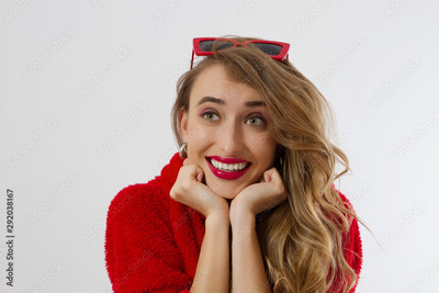 Closeup excited screaming young woman. shock, Shocked girl in red hoodie. Wow, surprised female. Fashion sweatshirt isolated on white background, face in red sunglasses. Beautiful, fashionable concept