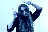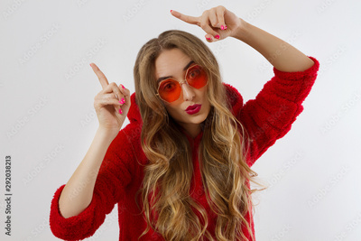 Young stylish woman with red lips, sunglasses and sweatshirt poiting copy space isolated on white background. Closeup girl face makeup. Fashion and beauty concept. Place for advertising