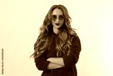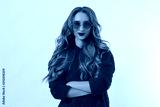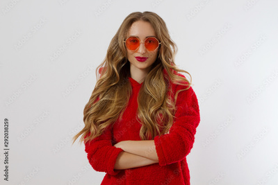 Closeup woman face in red sunglasses isolated on white background. Girl in red hoodie sweatshirt and red lips makeup. Fashion Beauty concept. Beautiful hair and fashionable accessories concept.