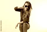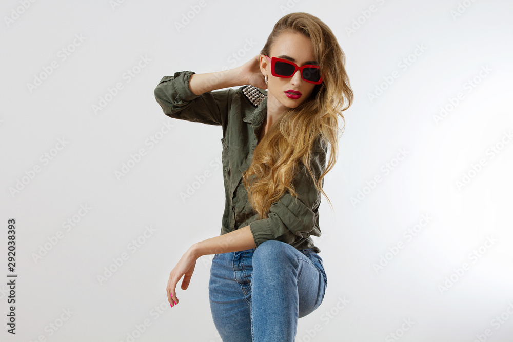Stylish woman in red glasses looking at camera at studio isolated on white background. Copy space. Trendy style of beautiful luxury model with red lips makeup. Long wavy shiny blonde hair