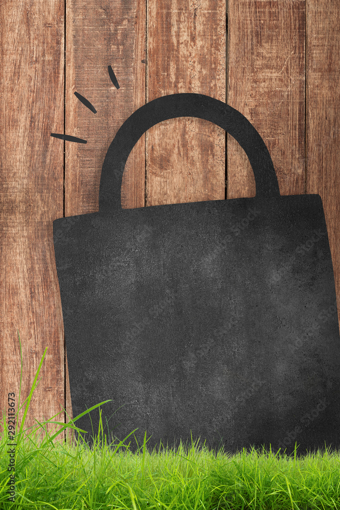 Panneau sac ardoise sur fond bois et herbe, avec espace pour texte.