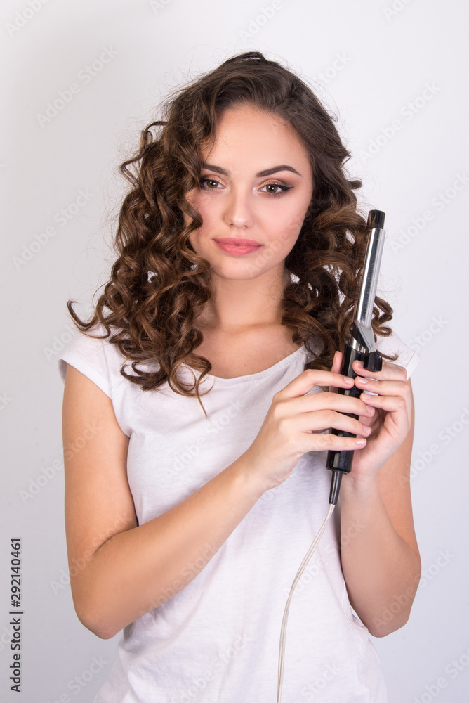 beautiful young woman with curly hair. Girl with hair curler isolated on white. Hairstyle and haircare model