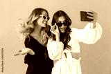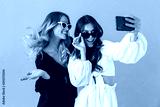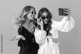 Portrait of two cheerful women taking selfie photo on smartphone