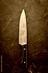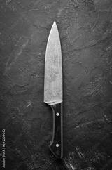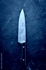 Kitchen old knife on a black stone table. Top view. Free space for your text.