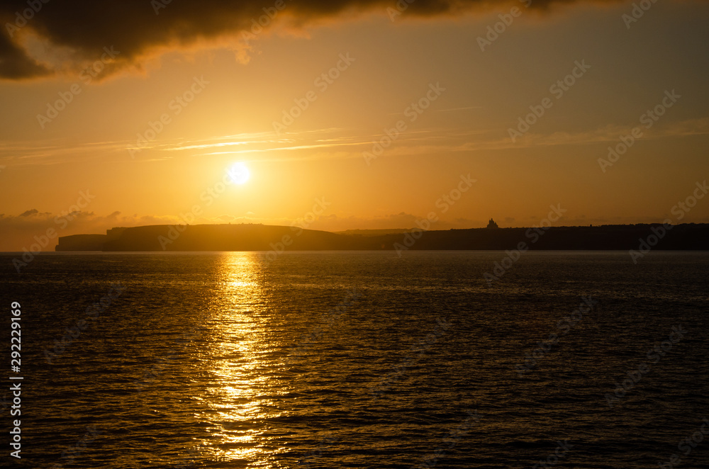 Orange Sunset in sea in Gozo, Malta. Golden orange sunset. Mediterranean Sea