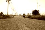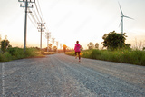 The evening sunset, The area of the wind turbine generates clean energy electricity, A woman is jogging on the road.