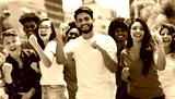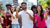 Group of cheering latin and caucasian and hispanic and african american young adults
