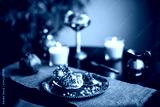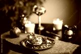 Still life composition with juicy red cut cleared pomegranate on a copper plate, burning candles and other oriental decor on the black table. Soft selective focus. Copy space.