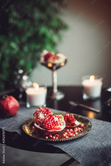 Still life composition with juicy red cut cleared pomegranate on a copper plate, burning candles and other oriental decor on the black table. Soft selective focus. Vertical card. Copy space.