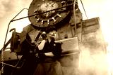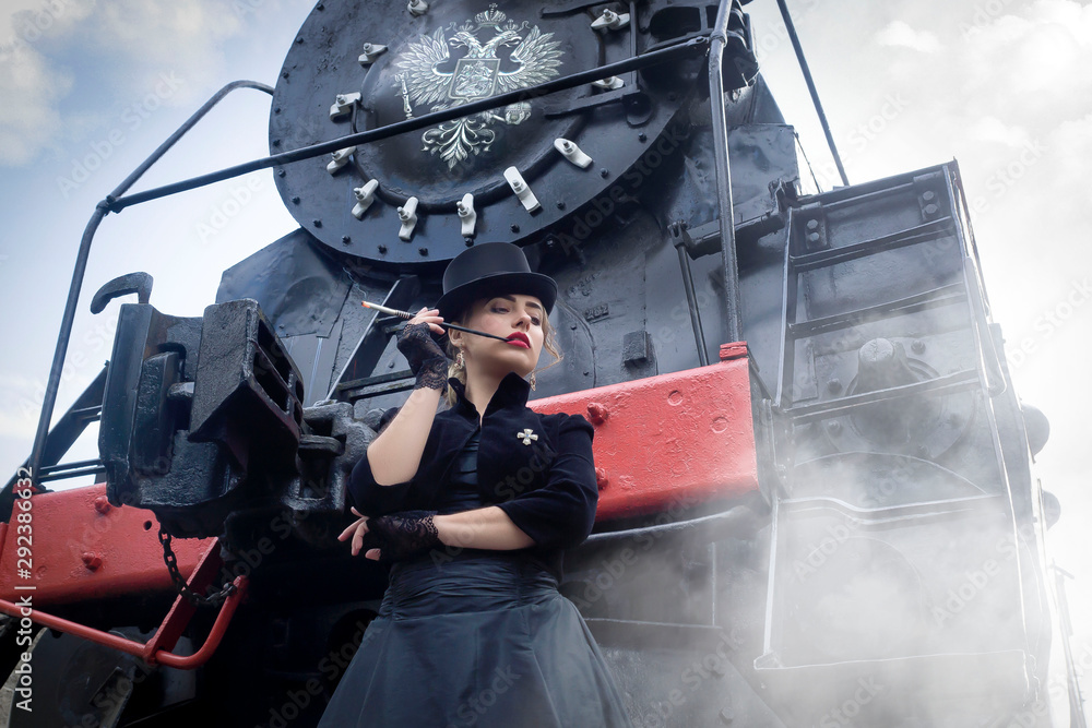 Steampunk girl in a black dress and hat near an old steam locomotive and large iron wheels. Blond beauty. Vintage portrait of the last century, retro journey.