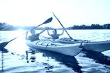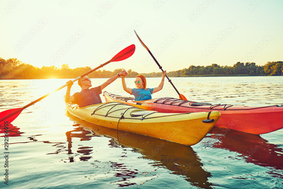 People kayak during sunset in the background. Have fun in your free time.