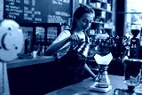 Professional barista preparing coffee using chemex pour over coffee maker and drip kettle. Young woman making coffee. Alternative ways of brewing coffee. Coffee shop concept.