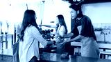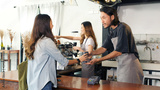 Zero waste concept, Asian woman customer giving her own coffee cup to barista, waiter, for buying takeout coffee at cafe counter