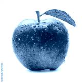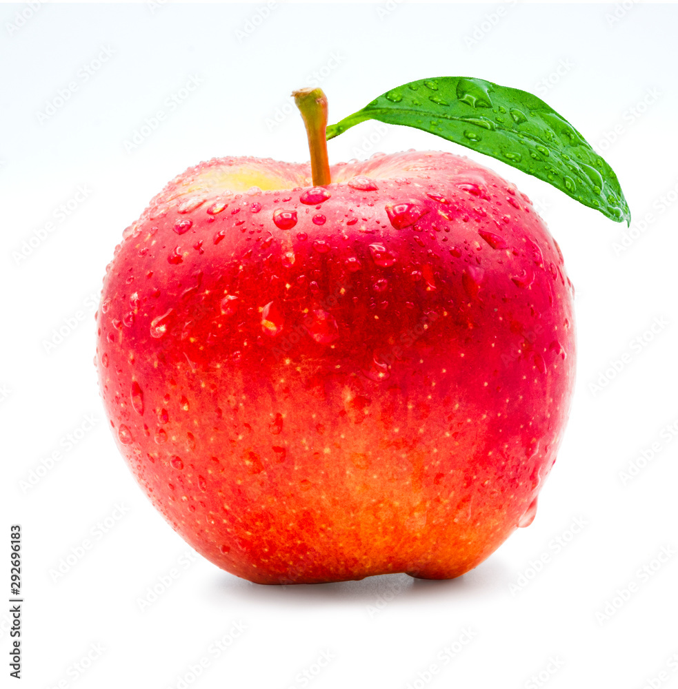 Fresh red apple with green leaf and droplet on white background. Isolated concept.