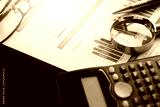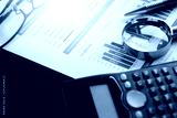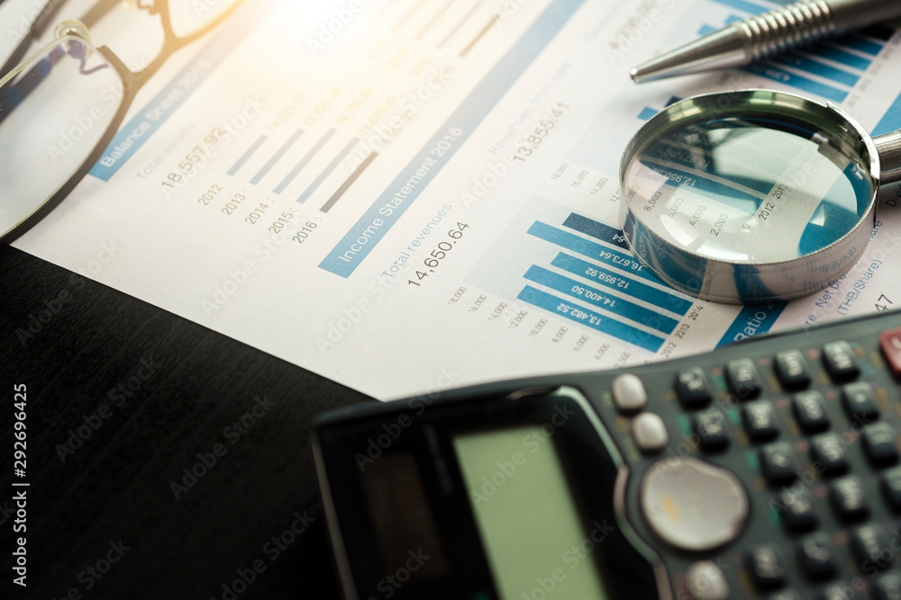 Magnifier glass calculator and financial data on businessman 's desk for analysis and find the best stock from stock market.