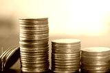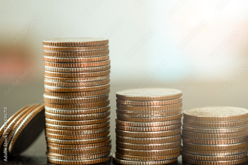 Money coins stacking on heap of coins. Saving for investment concept.