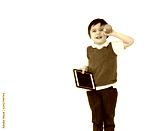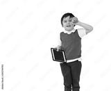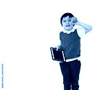 Isolated portrait of school kid with smiling holding tablet and eating green apple, Cute child boy with happy face wearing school uniform bitting apple on white background, Modern technology education