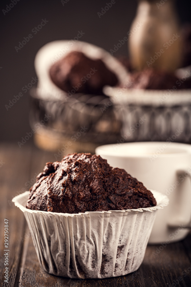 Chocolate muffins with banana in white paper cups on dark wooden background. Party food concept.