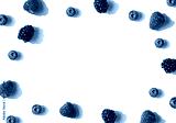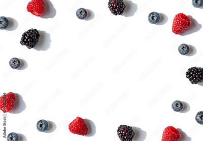 Raspberries, blueberries and blackberries frame with shadows on the white background. Top view. Copy space