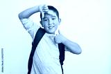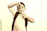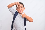 Beautiful student kid boy wearing backpack standing over isolated white background smiling making frame with hands and fingers with happy face. Creativity and photography concept.