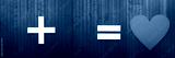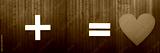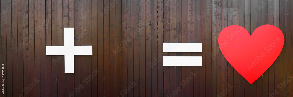plus, equal and heart symbol on brown wooden wall. Long horizontal banner with copy space. Creative concept or wedding and St. Valentime's day