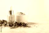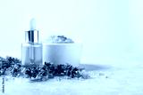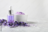 Natural cosmetic oil, bath salt, scrub and lavender flowers on grey marble table, space for text