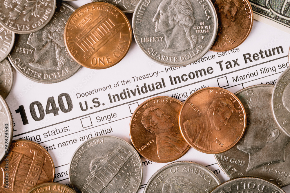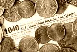 Closeup image of american 1040 Individual Income Tax return form with coins