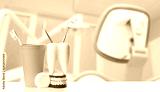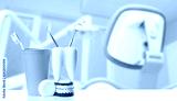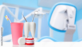 Dental mirror and dental explorer instrument in white tooth model, human jaw and dental floss near toothbrush in pink glass against dental office background.