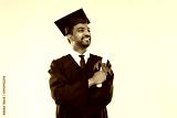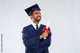 education, graduation and people concept - happy smiling indian male graduate student in mortar board and bachelor gown with diploma over grey background