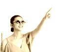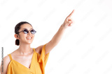 Asian woman pointing finger to above with smile face. Beautiful Asia girl wear sunglasses, nice dress in summer season. Pretty woman has short hair. use for advertising, isolated on white, copy space