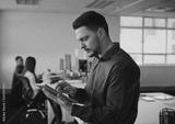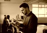 Portrait of young businessman busy using digital tablet while his colleague working in background at modern office