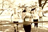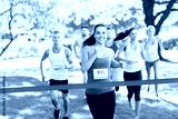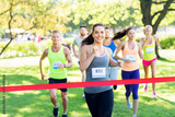 fitness, sport and success concept - happy teenage girl winning race and coming first to finish red ribbon over group of sportsmen running marathon with badge numbers at park