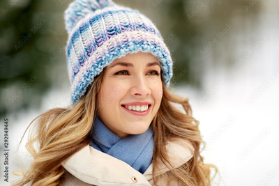 people, season and leisure concept - portrait of happy smiling woman outdoors in winter